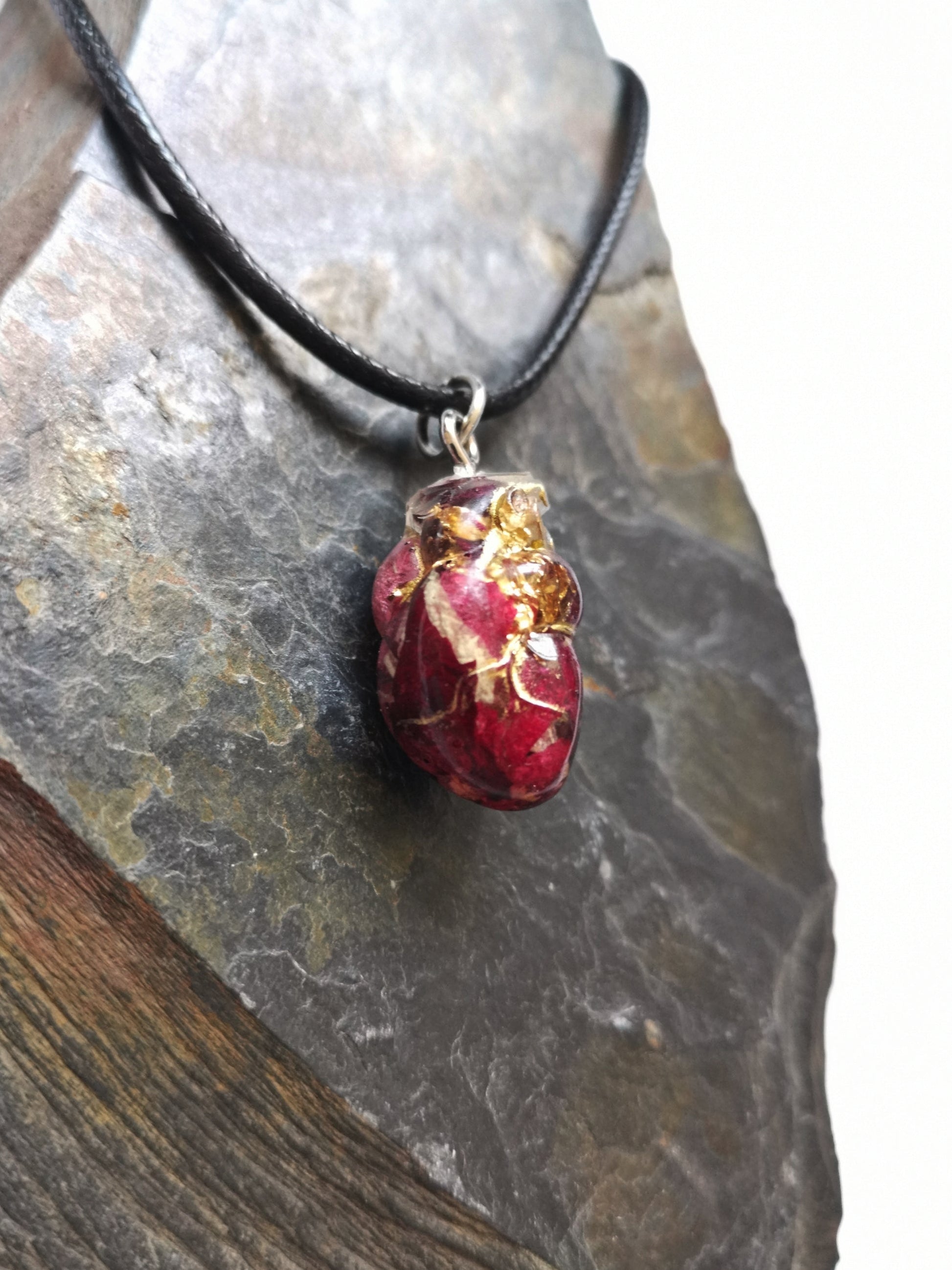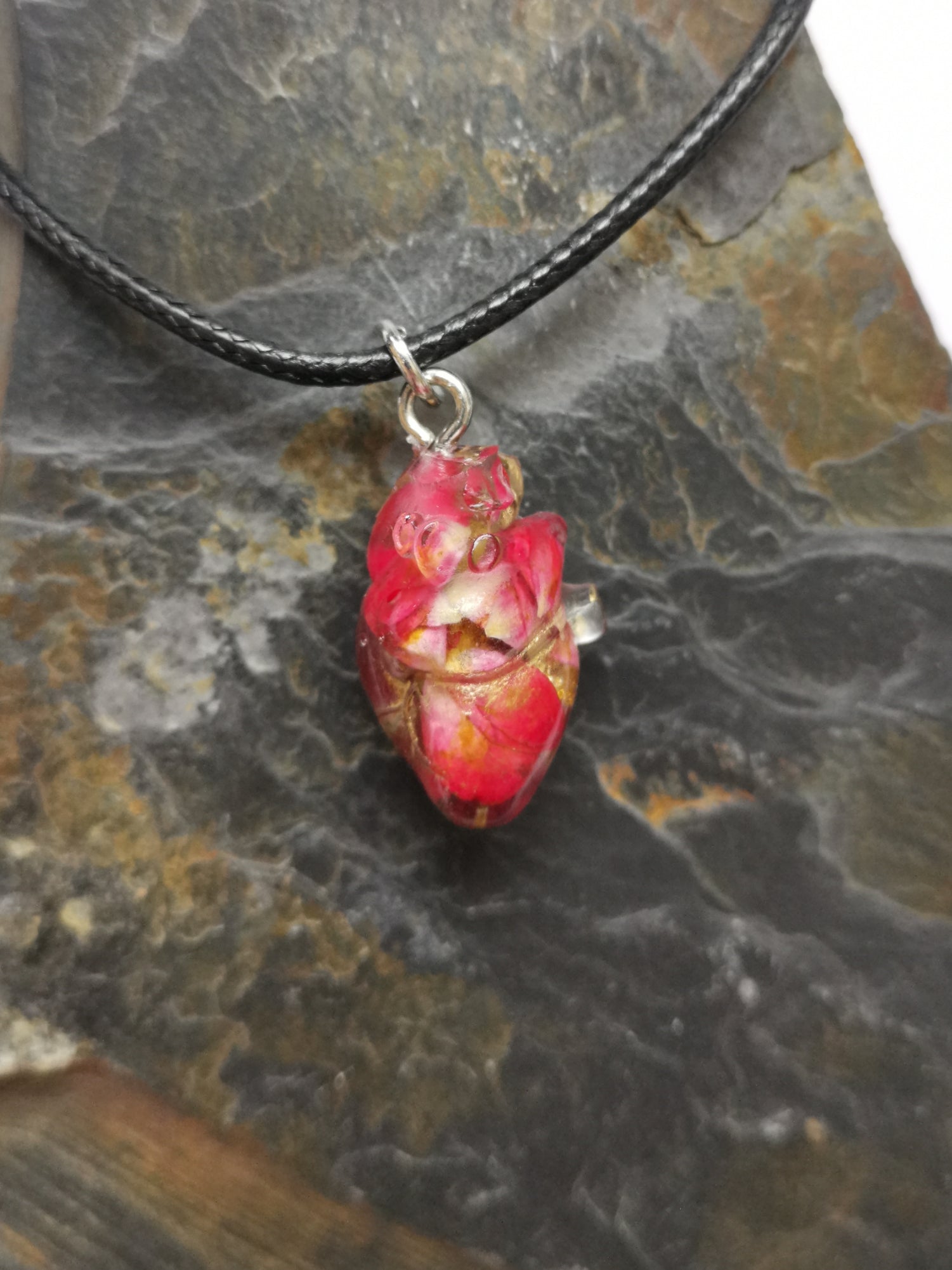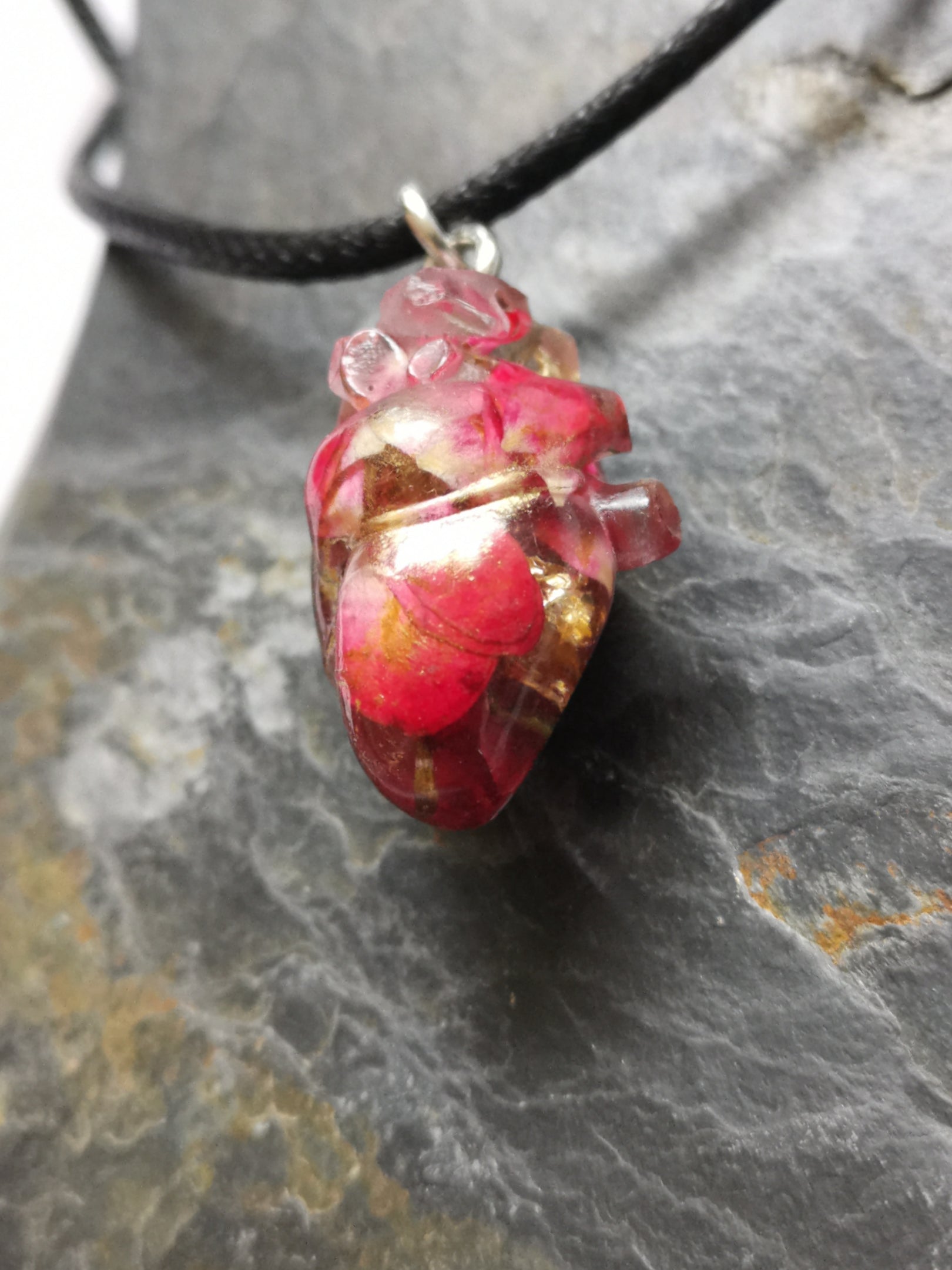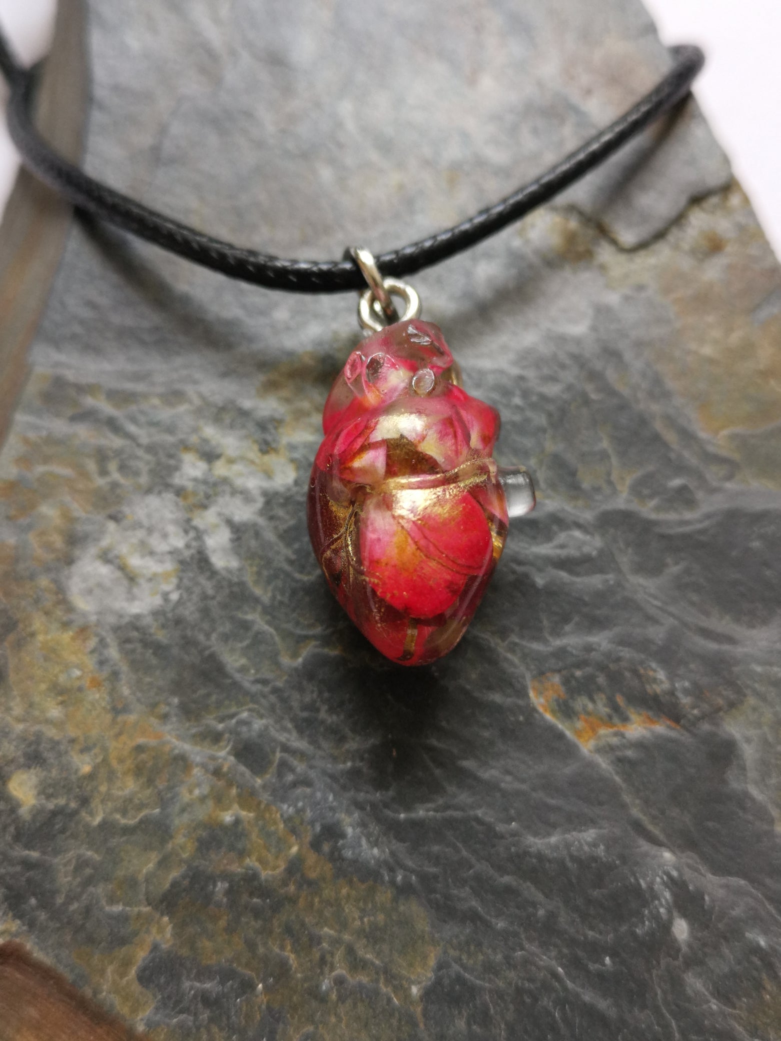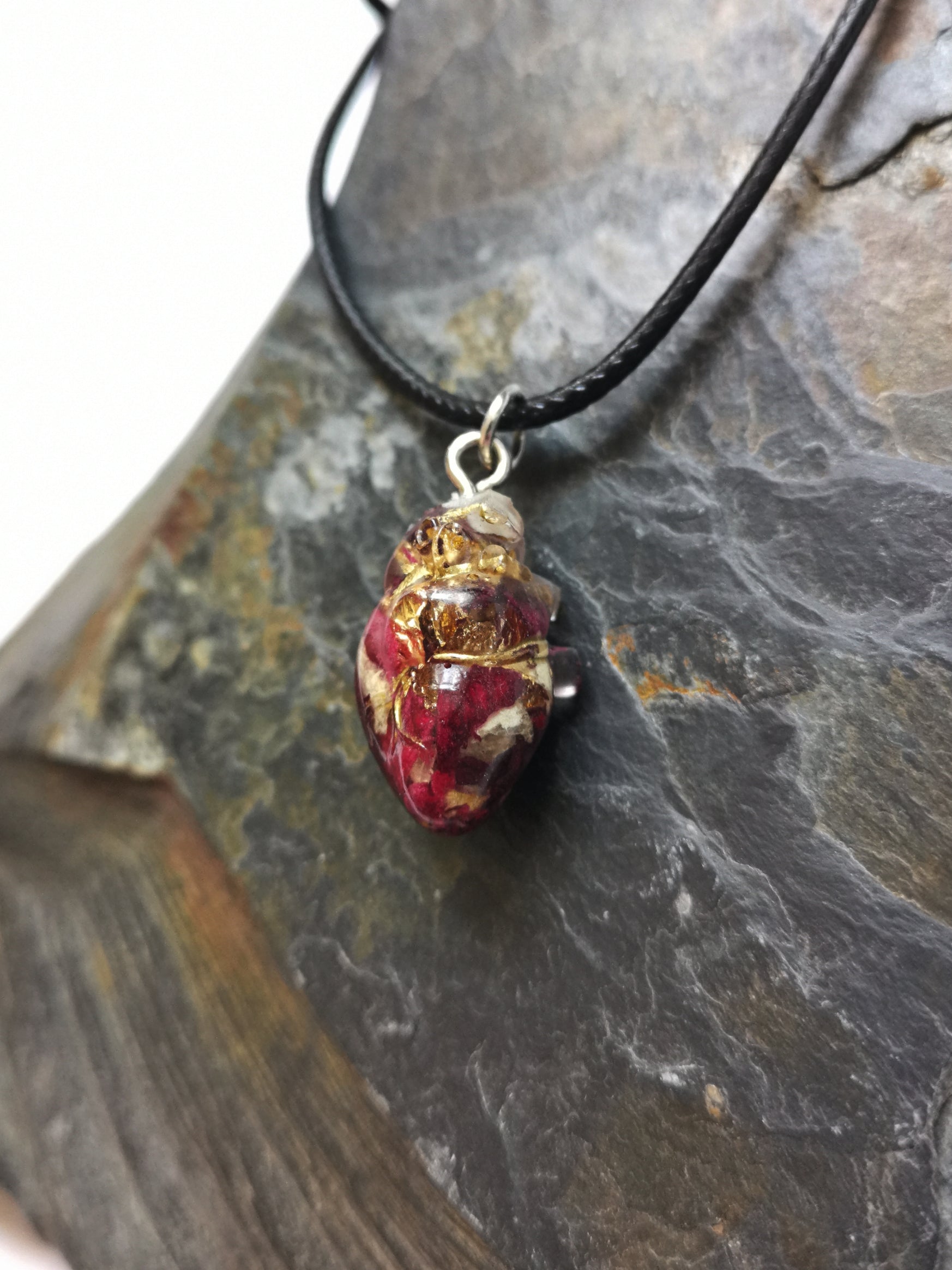 Let them fall in love with these resin pendants of realistic hearts decorated with flowers, gold or silver leaves, or even colors. Add a romantic, gothic and original touch to any look.