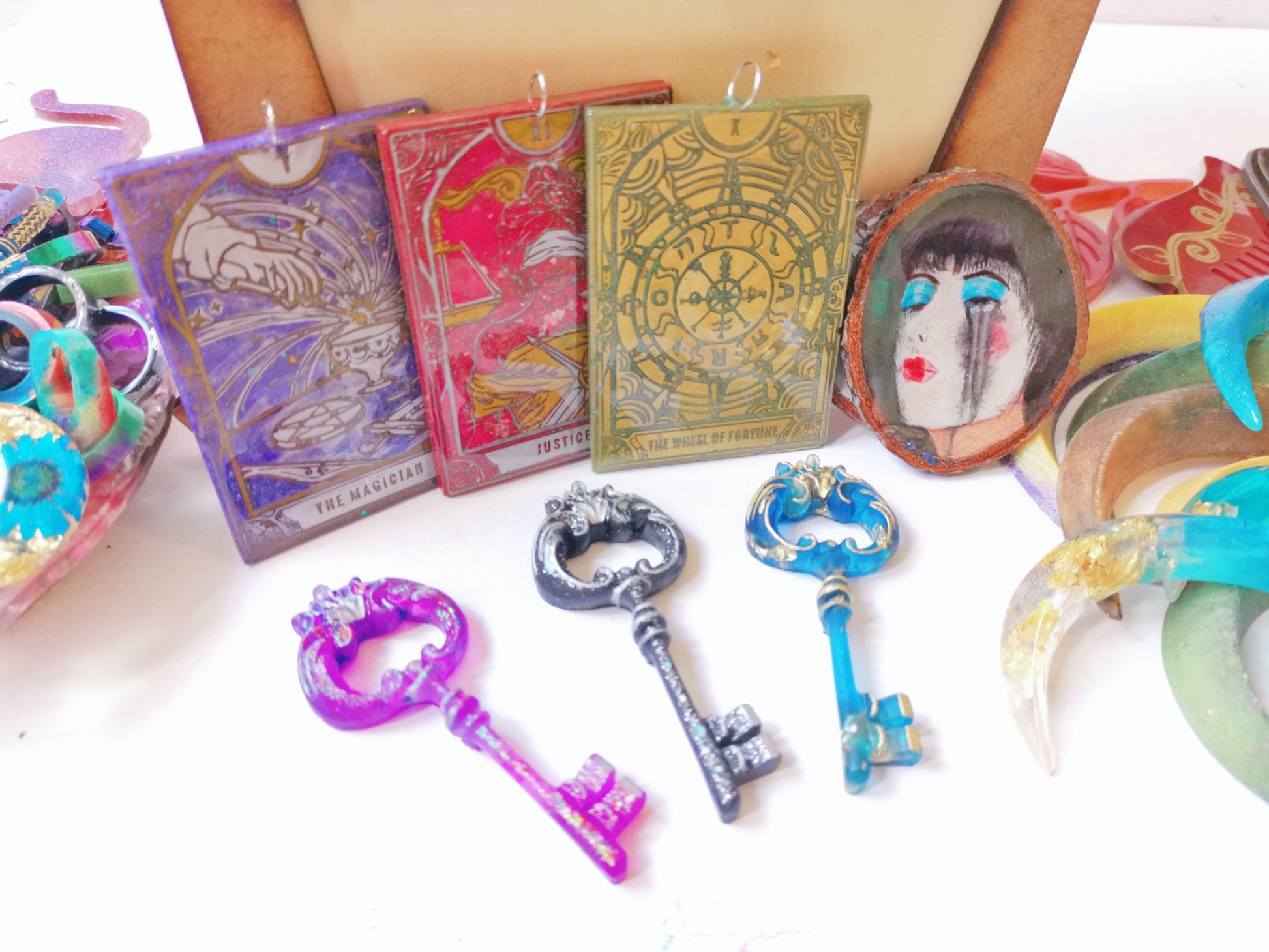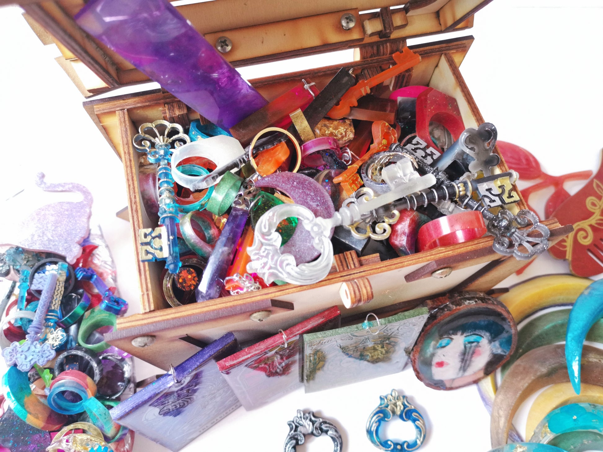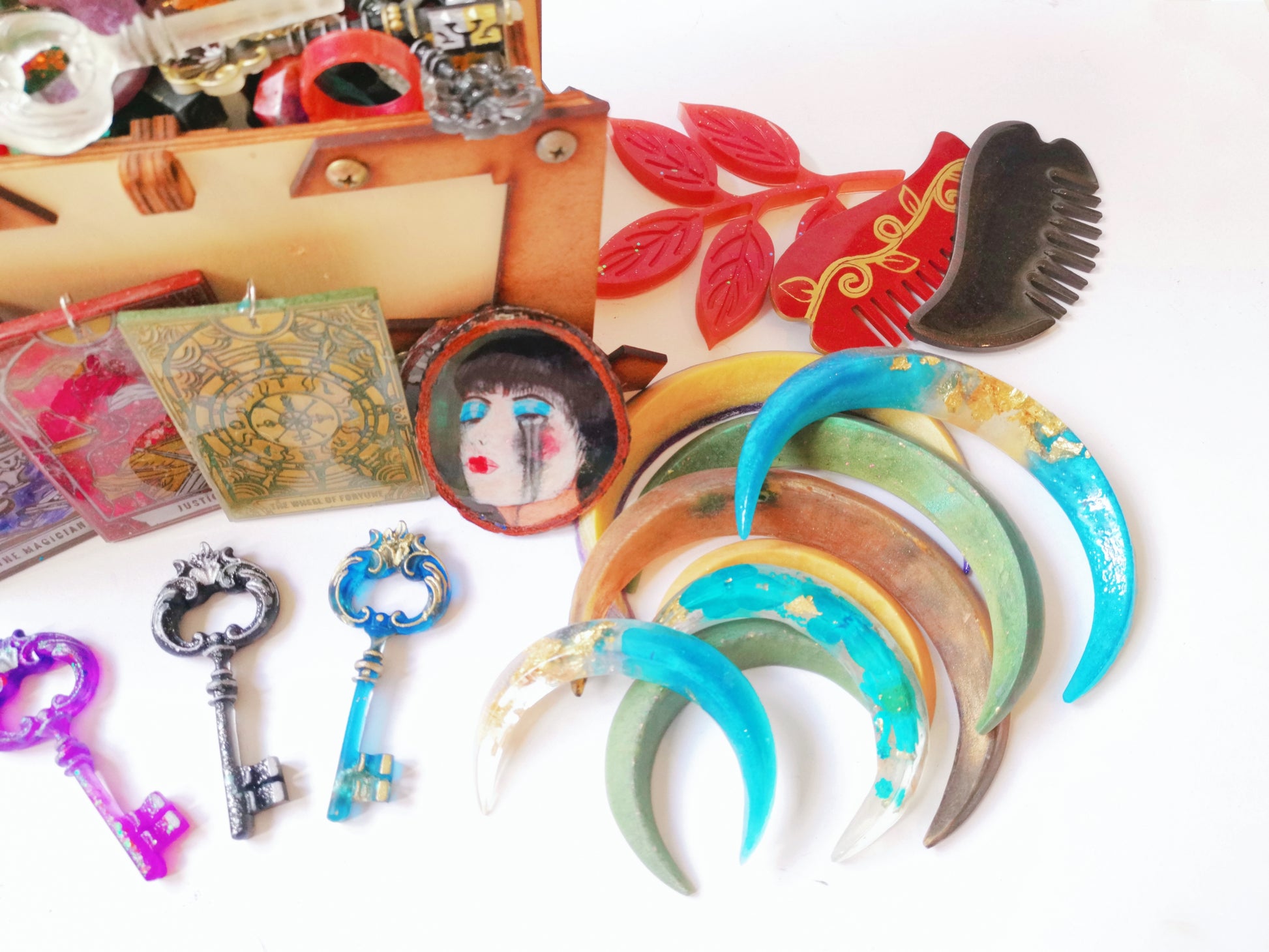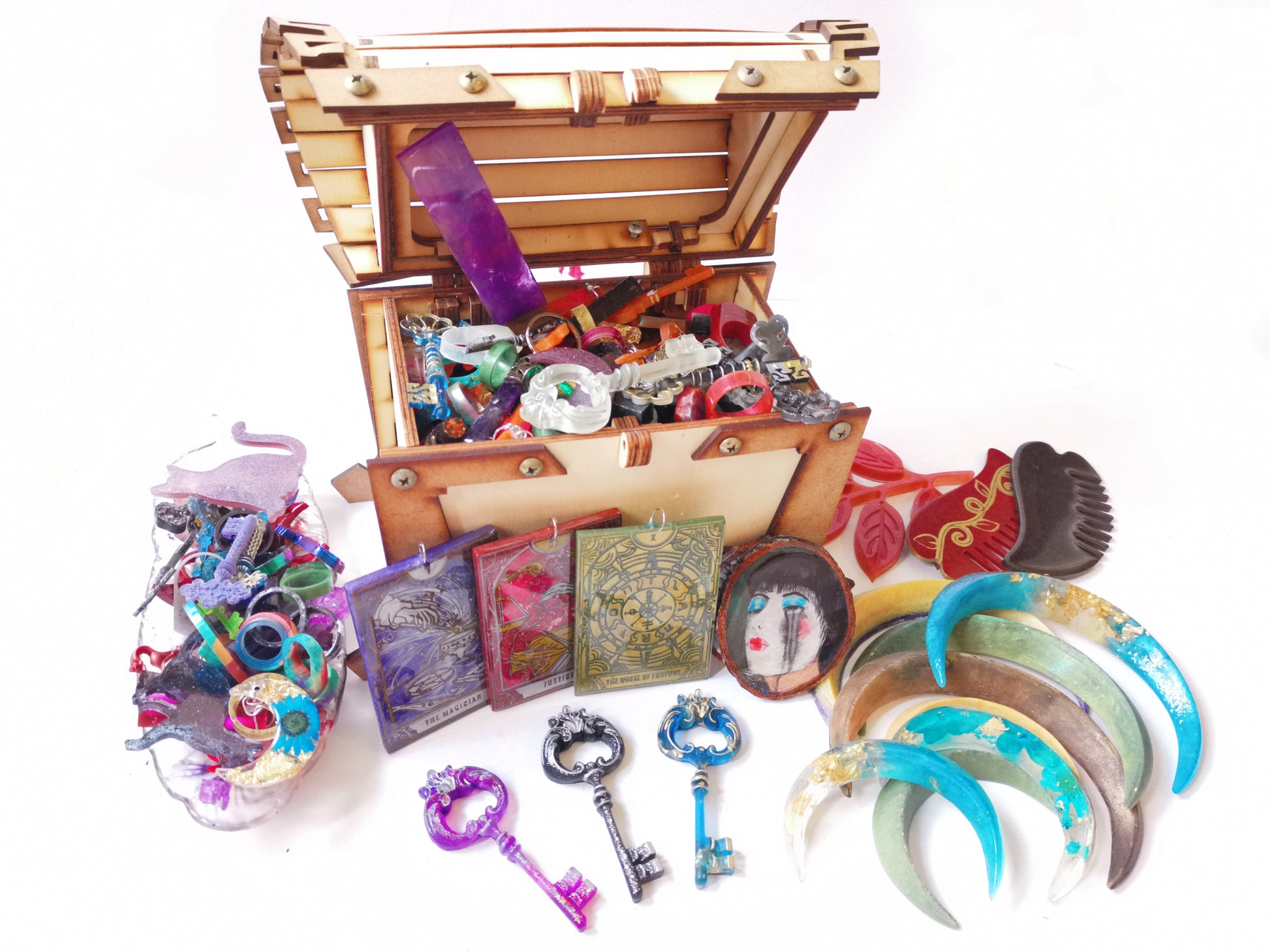 Travel to a mysterious world with Trésor de Corbeau. Each scoop contains resin charms, including rings, pendants and small keys. But the real treasure is the guaranteed prize: a hair moon, a tarot card, a small painting on wood or a large key.