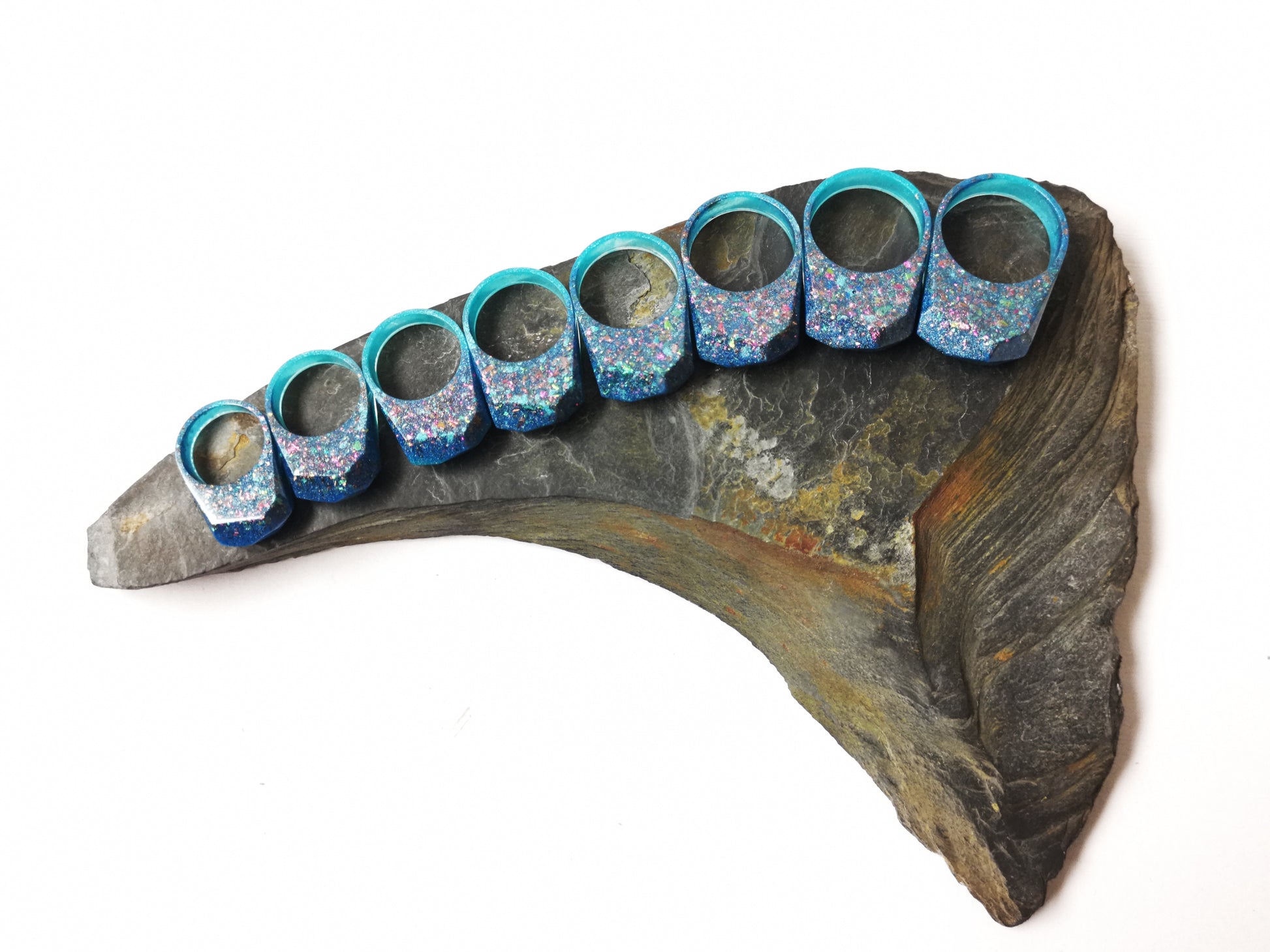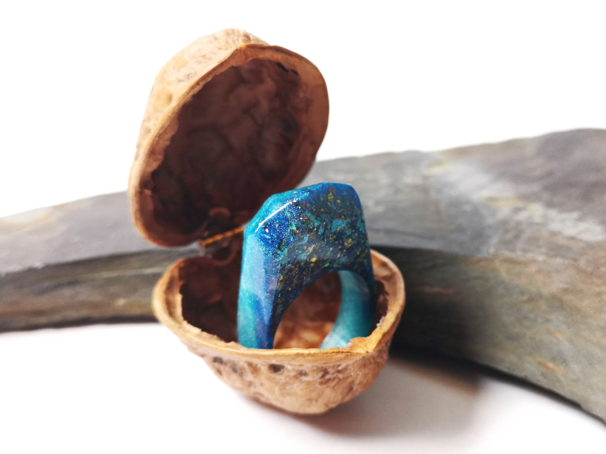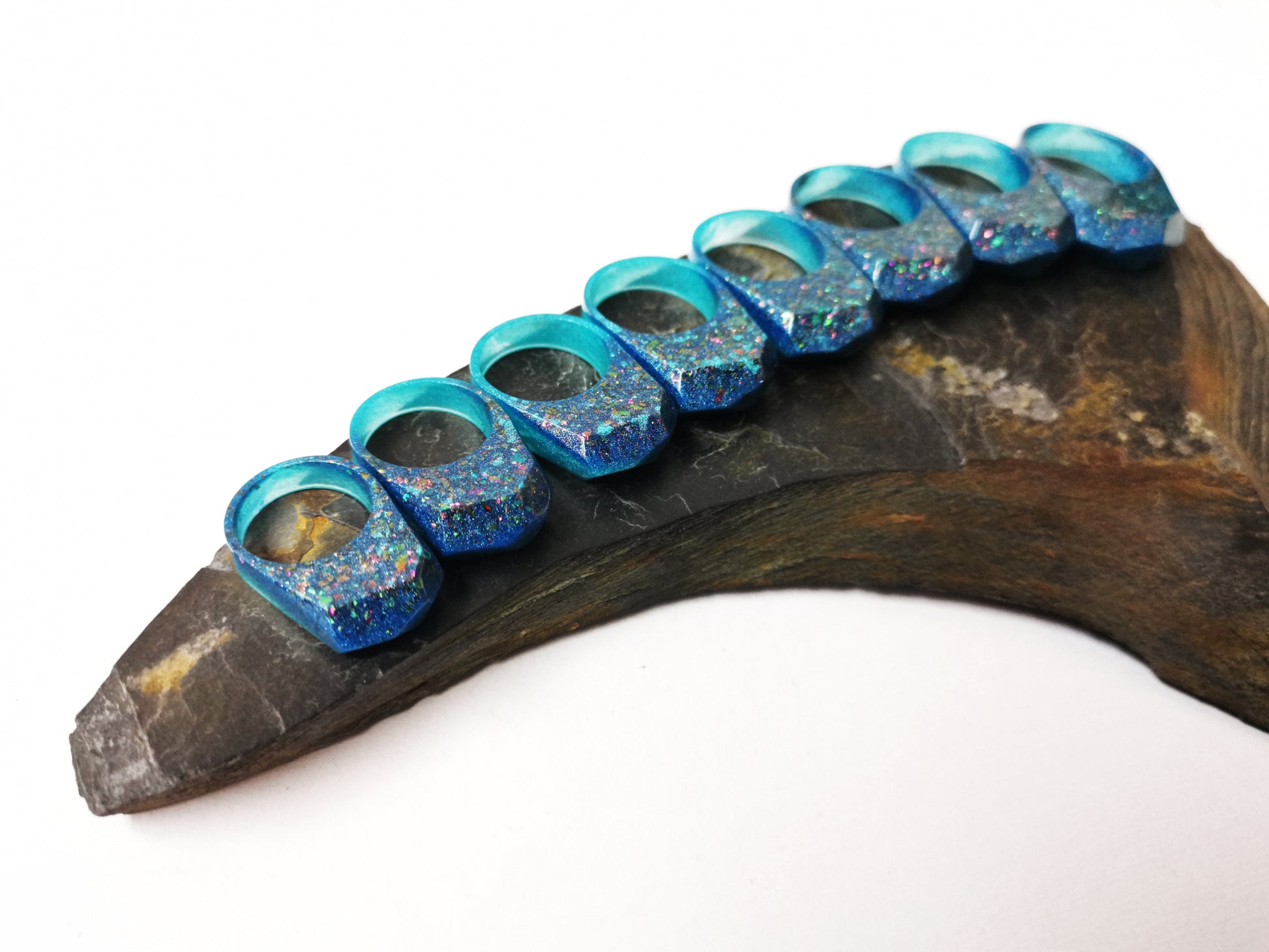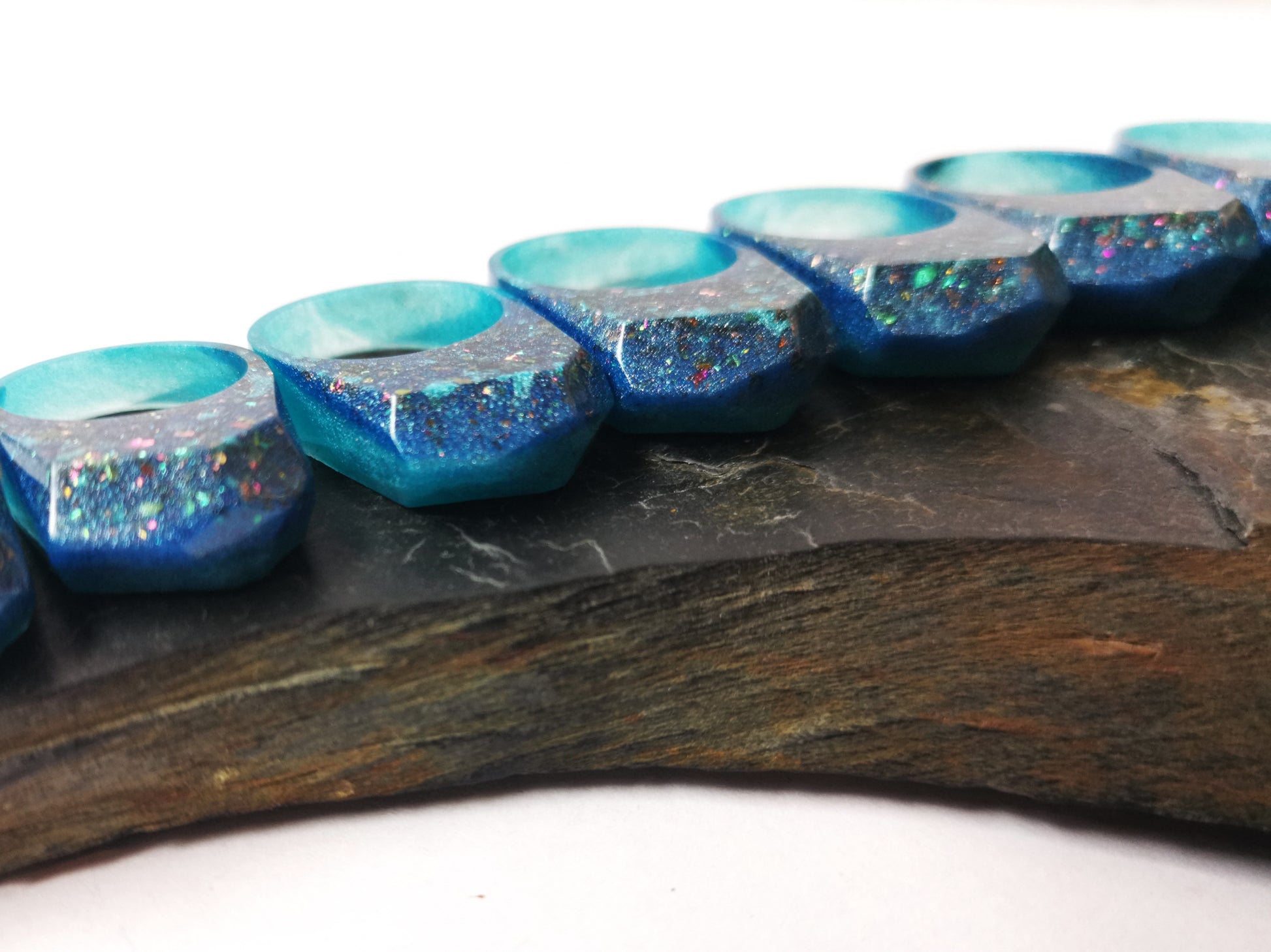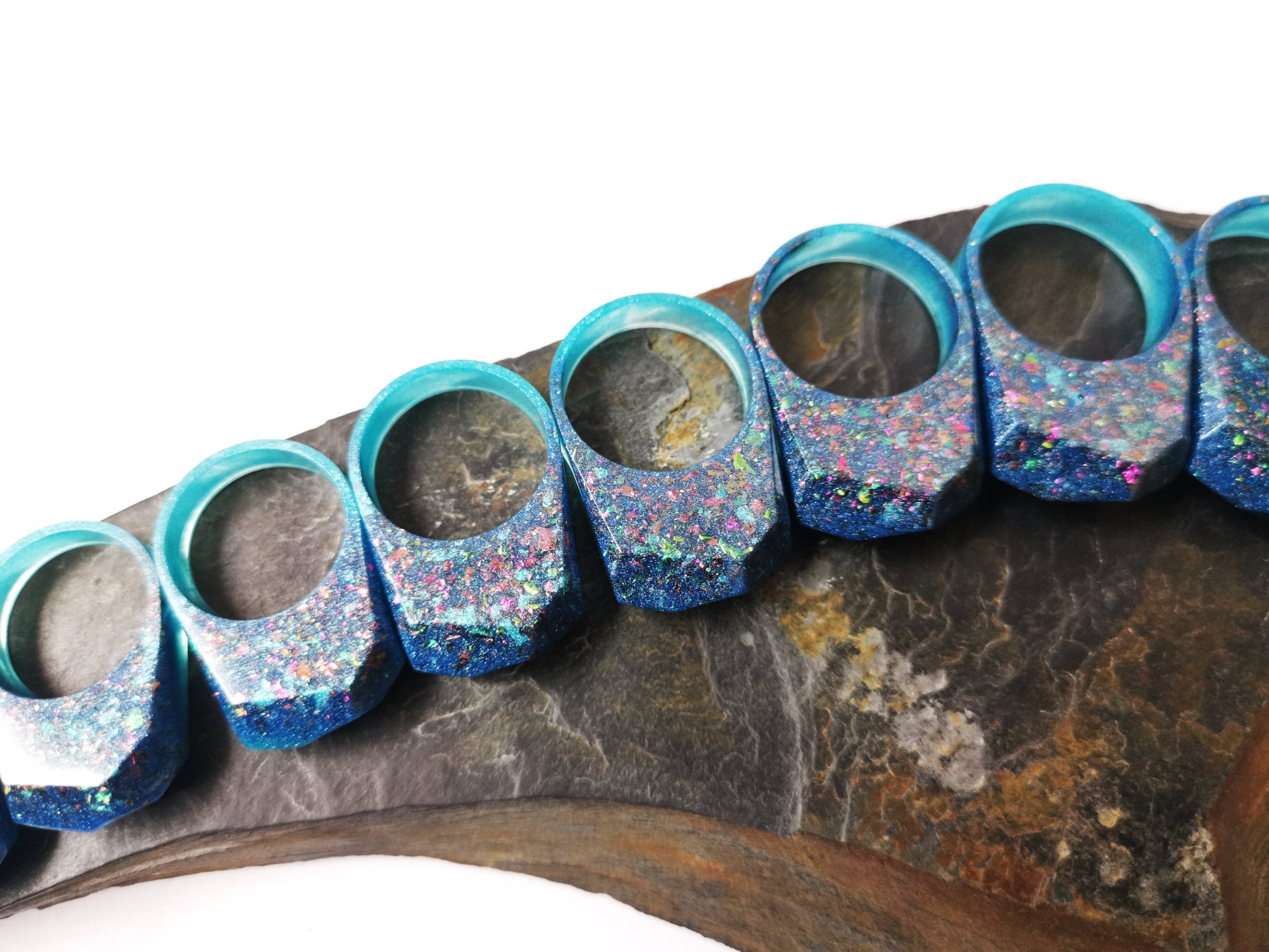 Avec Poussière d'Étoile Azur, vous porterez un bijou magique. Ces bagues en résine sont faites à la main et ont une couleur bleue luxueuse avec des étincelles vives et colorées qui illumineront votre look. Offrez-vous une touche de magie!